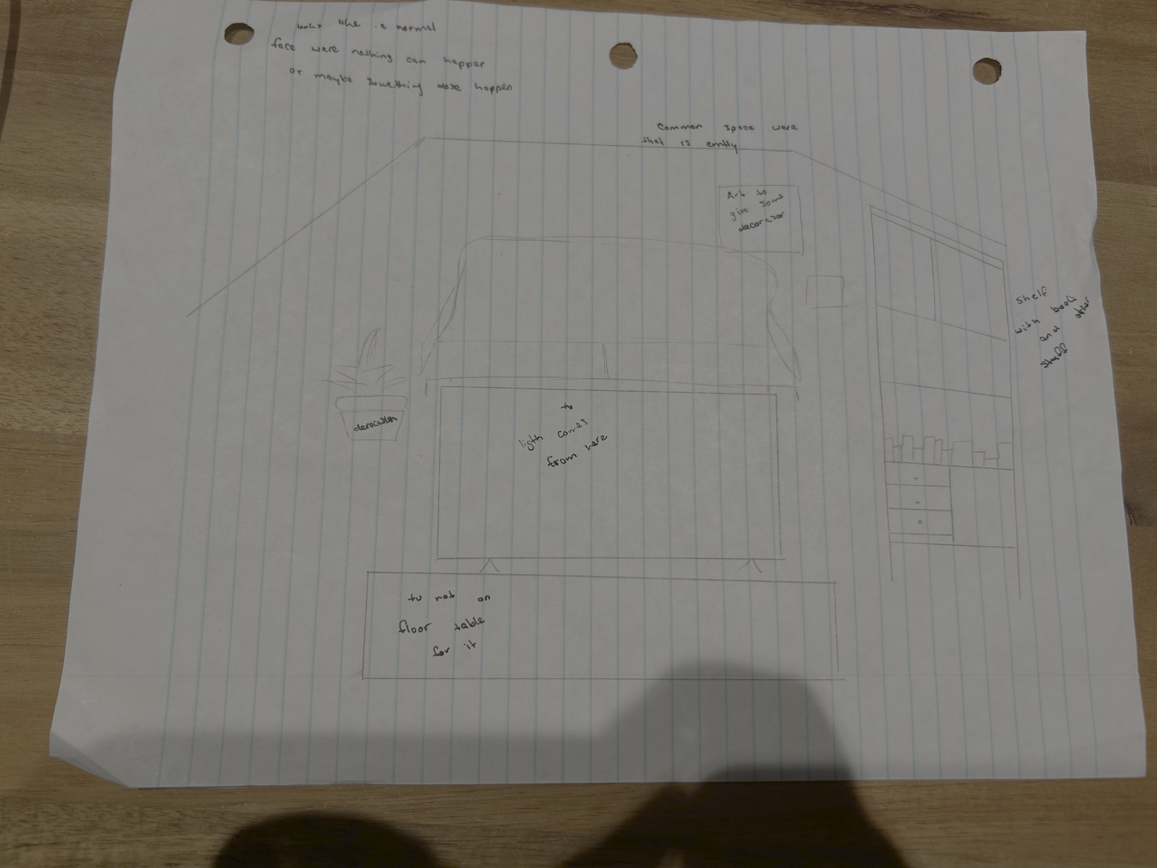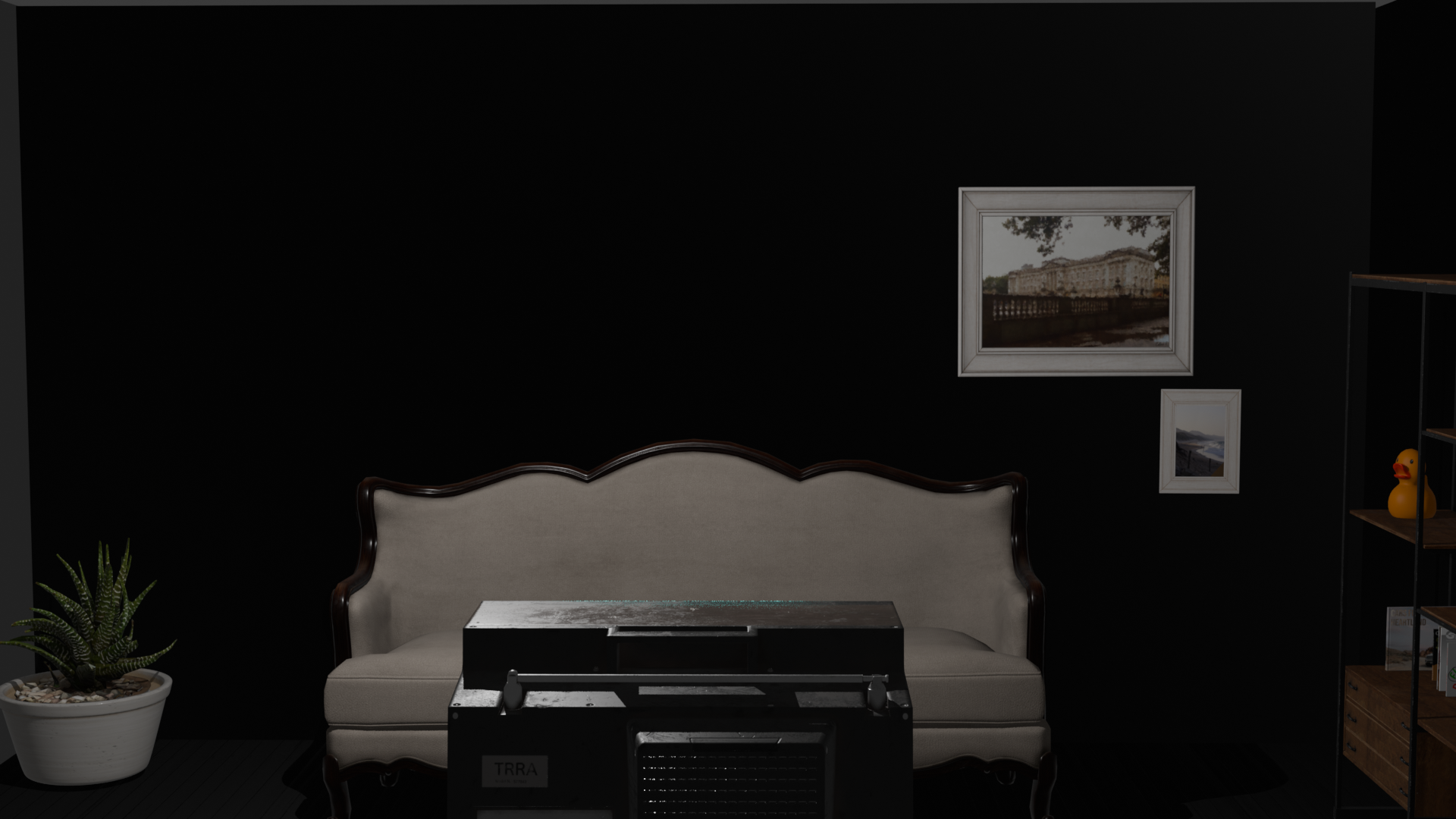 The idea for this layout was to create a living room with a shelf with some books. With some other little knicknacks. There are also some picture frames in the background. On the another side of the room there is a plant to bring some type of life. There is a tv in the front of the room were the ligth soucre is coming from.